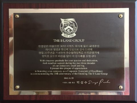 多年以來,與韓國、日本、美國和歐洲的知名企業和品牌合作,并贏得客戶的認可。獲韓國E-LAND集團“優秀合作企業”獎、韓國SHINSEGAE集團“優秀合作公司”獎、 韓國HOMPLUS公司“最佳合作公司”獎。
